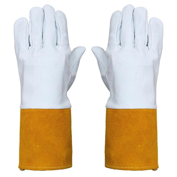 Grain Goatskin Leather TIG Welding Gloves with Extended Yellow Cuff, White, Size: Large, Pair 1
