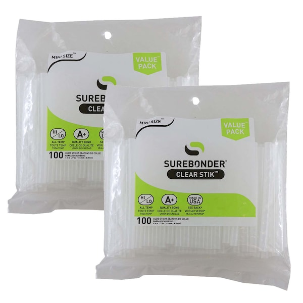 Surebonder all-temperature mini hot melt adhesive works at either low temperature (230 degrees F) or high temperature (380 degrees F) for everyday gluing projects. Use with high or low temperature glue guns. Bonds to metal, wood, paper, fabric, magnets, ceramics, floral arrangements, glass and plastic using a high temperature glue gun. Bonds to delicate materials such as balloons, ribbon, lace and children's crafts using a low temperature glue gun. Clear color with 60-65 second working time. 5/16"diameter x 4" length. 100 sticks per bag. Sold as 2 bags for a total of 200 glue sticks.