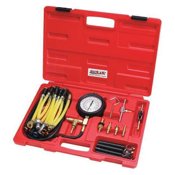 Fuel Injection Pressure Tester Kit, Tool Type Fuel Pressure Tester, Length 18 in, Width 14 in, Height 6 in, Material Steel, For Vehicle Tool Category Vehicle Lubricants, Color Red, Includes 5/16 in, 3/8 in, 9/16 in, 14mm, and 12mm Fuel Line Adapters, Fuel Filters, Fuel Injection Canister Line Adapter, Pressure Regulators, Shut-Off Valve Assembly, Number of Pieces 30, Application Automotive, For Use With Fuel Injection