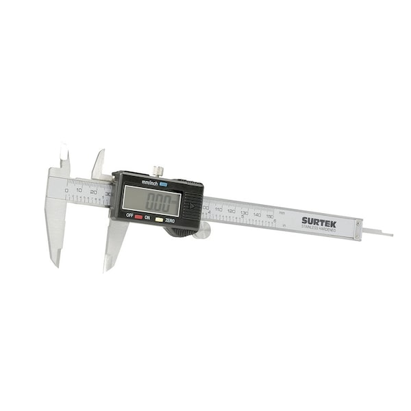 Digital Vernier 0-6" Surtek. Able to set zero at any position. Readings and conversions in millimeters and inches. Serial output for computer or printer interface. Able to compare, measure between centers, measuring grooves, etc. Made of stainless steel.