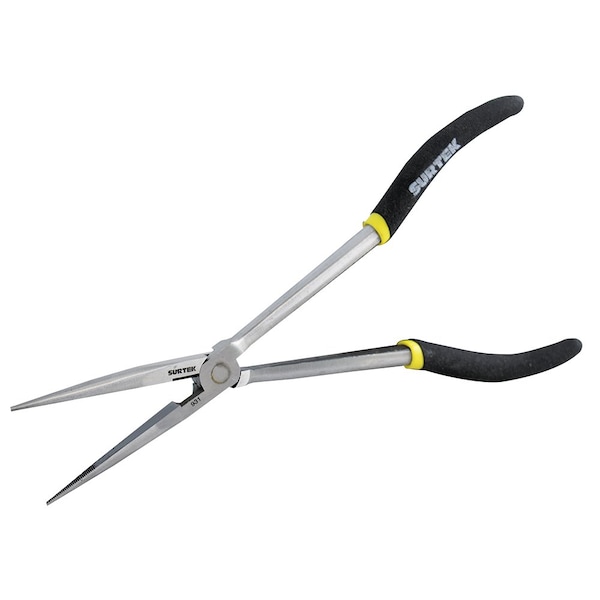 Longreach longnose pliers 11 Surtek Made of grade 55 carbon steel Double plastic handle Fine and thick straight serrated tips Extra long handle that allows working in hard to reach areas