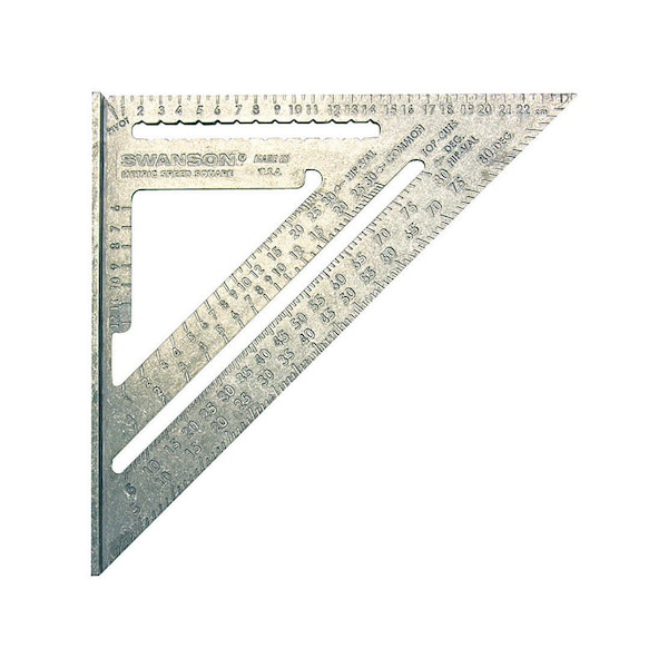 METRIC SPEED® SQUARE 25 CM W/BLUE BOOK, EN/SP/FR PKG (10 IN. US) This is the 25 cm metric version of the Swanson® Speed® Square. The Swanson® Speed® Square was first developed by company founder Albert Swanson in 1925. This innovative tool combines 5 tools into 1: 1. Try Square, 2. Miter Square, 3. Saw Guide, 4. Line Scriber, & 5. Protractor. The Speed® Square is die-cast for durability and accuracy. Made of heavy-gauge aerospace aluminum alloy, it is built to last. The Speed® Square includes the Swanson® Metric Blue Book of Rafter Length and Roof Construction and also features markings for using the Swanson® One-Number® Method of rafter layout. The Swanson® Speed® Square is our most popular product and remains the most trusted square of its kind. Look for the Diamond® cutout for genuine Swanson® products.