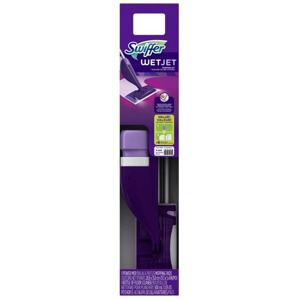 With a dual nozzle sprayer and a strong grip pole, this all-in-one cleaning system is designed to break up and dissolve tough messes. Its uniquely designed solution penetrates layers of dirt and grime and traps and locks it deep into the WetJet pad. Its scrubby strip breaks apart tough dried-on spots and messes. Great for wall-to-wall, whole floor cleaning, high-traffic areas, tough stains on finished hardwood, ceramic and tile surfaces. Includes 1 power mop with screening strip, 2 cleaning pads and 1 bottle multi-purpose cleaning solution. Hang tag.