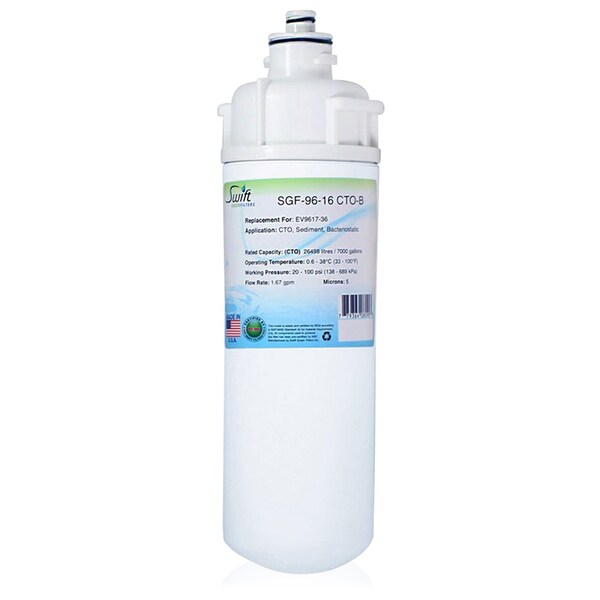 The Swift Green Filters SGF-96-16 CTO-B commercial water filter is a compatible Everpure replacement providing fresh, clean, and great tasting drinking water. This high quality filter reduces: - chlorine taste and odor - sediment, dirt and rust - bacteriostatic - cartridge: 4CB5-K Cartridge. Our filters are made with activated carbon produced using a new technology that carbonizes dried coconut shells. Coconut carbon is superior to other sources of activated carbon. It has 50% more micro-pores for capturing contaminants. For more information please visit the Swift Green Filters website.