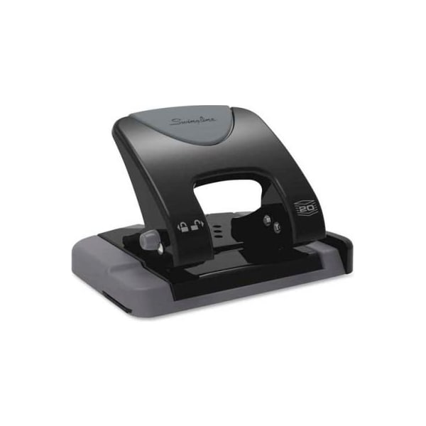 Swingline 2-hole punch 9/32" punch size with 12 sheet capacity perfect for any office worker's desktop, this easy-to-use two-hole punch reduces the amount of effort it takes to punch holes. The low-force punch design of the smarttouch makes it 50 percent easier to use than with a standard paper punch. Punch two crisp, clean holes through as many as 20 sheets. Hole pattern in punch base allows you to see when chip tray is full. Punch has a removable base and a back opening for quick paper-chip disposal. The resulting 9/32" holes from the fixed punch heads are perfectly spaced to easily insert sheets into a two-ring file or folder. Soft grip handle further increases comfort of the manual hole punching. Handle locks into a closed position for compact storage. Durable, metal hole punch also features an 8-1/2" to 11" extendable paper guide, built-in ruler and edge guide for better punch alignment.