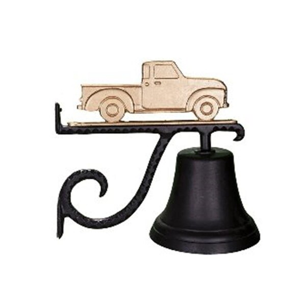 Cast Bell with Gold Classic Truck Ornament Enjoy The nostalgic look and sound of this cast aluminum bell at an entrance or mounted on a post in your garden. Features -Baked on satin black enamel finish -Ornament Color - Gold Bronze -Bell Dimension - 6 in. High with a 7.75 in. Diameter base -Bracket Dimension - 9 in. High x 12.5 in. Long -Ornament Dimension - 4.25 in. High x 9.75 in. Long