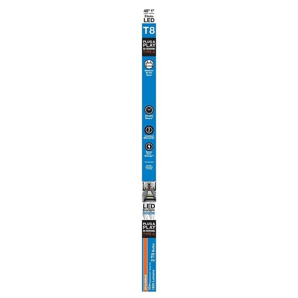 Sylvania LED Bulb, Linear, Type A Replacement, 15 W Wattage, 120/277 V, G13 Medium Bi-Pin Lamp Base, T8 Lamp, Lamp Material: Glass/PET, Frosted Lamp, 1800 Lumens, Daylight Light, 5000 K Color Temperature, 80 CRI, 35,000 hr Average Life, Dimensions: 1 in Dia x 48 in L, Suitable for: Plug N Play with Ballast