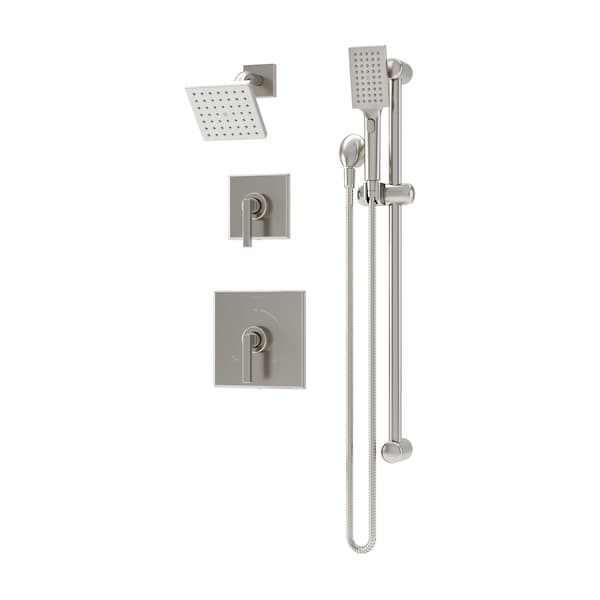 Introducing the Duro Two Handle Wall Mounted Tub and Shower Trim Kit, which is coated in a scratch resistant finish over solid metal, ensuring long lasting elegance in your bathroom. This kit includes a shower arm, low flow showerhead, hand spray with a 60 inch flexible hose, a slide bar for the hand spray, brass escutcheon, and adjustable lever handle. The solid brass valve cover plate has hot and cold indicators, enabling effortless customization of water temperature. The single mode showerhead is WaterSense certified with an eco friendly low flow rate of 1.5 gallons per minute. The showerhead is powered by HydroMersion technology, which channels water for increased pressure and force, creating a total spray pattern with 49 individual nozzles for complete coverage. Enjoy hassle free installation with everything you need included in this model, allowing you to effortlessly update your bathroom without replacing your valve. Elevate your bathroom with Symmons and enjoy the perfect balance of style and functionality, backed by a limited lifetime consumer warranty.
