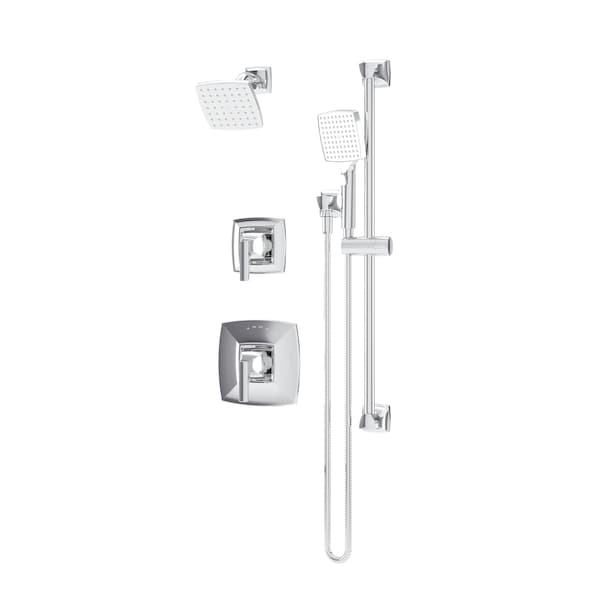 With its versatile appeal, the Symmons Oak Collection's transitional design complements a variety of bathroom styles. This Oak shower system includes a 5 inch single function showerhead and a 4 inch hand shower wand, both featuring HydroMersion technology that channels water for increased pressure and force. The hand shower wand offers a total spray and push button pause mode for a non positive shutoff. Equipped with EverFlow rubber spray nozzles, both the showerhead and wand are non corrosive and easy to clean. The set also includes a 30 inch hand shower slide bar with a 60 inch flexible metal hose. The shower system has a low flow rate of 1.5 GPM (5.7 L/min). The product comes with the Symmons' Limited Lifetime Residential Warranty and a 10 Year Limited Commercial Warranty.
