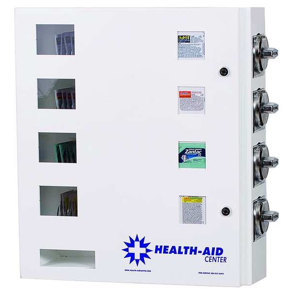 Medicine Vending Machine, Material Steel, Overall Height 16 in, Overall Width 19 in, Overall Depth 4 in, Compartments per Selection 128, Number of Selections 4, Payment Configuration (3) US Quarters, Color White, Includes Stand No Stand, Mountable Wall Mount, Number of Coin Mechanisms 4, Weight 33 lb
