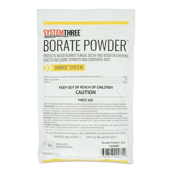 EndRot Borate Powder is designed to help address wood destroying insects and rot. Use EndRot Borate Powder in combination with the other System Three rot restoration products. Using disposable safety gloves, measure the appropriate amount of EndRot Borate Powder and warm water. Mix until the powder completely dissolves. Borates, when mixed with water, have an unlimited shelf life. Because of this, you can store any remaining solution in an airtight container for future use. Apply the borate solution with a brush or large pump style sprayer. Saturate the affected wood. Since borates are water soluble, treated wood components with ongoing exposure to moisture will require periodic maintenance applications. Allow at least one hour for the borate powder solution to soak in. If the substrate is not dry after one hour, you can use a blow dryer or heat gun to force dry the area.