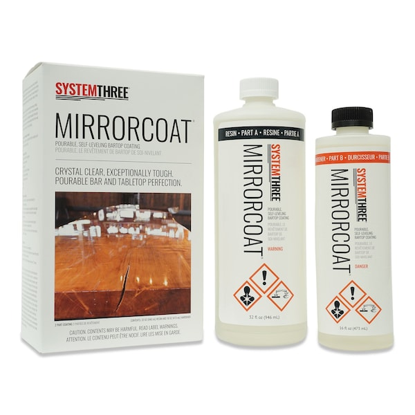Mirror Coat is a decorative, two-part, self-leveling table top epoxy. It forms a high gloss, protective clear coat for wood and many other materials. Our tabletop epoxy creates a hard, clear layer on horizontal surfaces. Unlike most bar or countertop epoxy coatings, MirrorCoat is mixed at a ratio of two parts of resin to one part of hardener by volume.