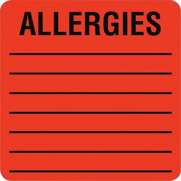 Square medical labels for allergies alert staff of patient allergies to avoid medication mishaps. Fluorescent, easy-to-read labels stand out on patient files and charts and clearly state the word "Allergies" in capital letters. Simply write in the allergies on the provided seven lines. Self-adhesive back makes the allergy labels easy to apply.