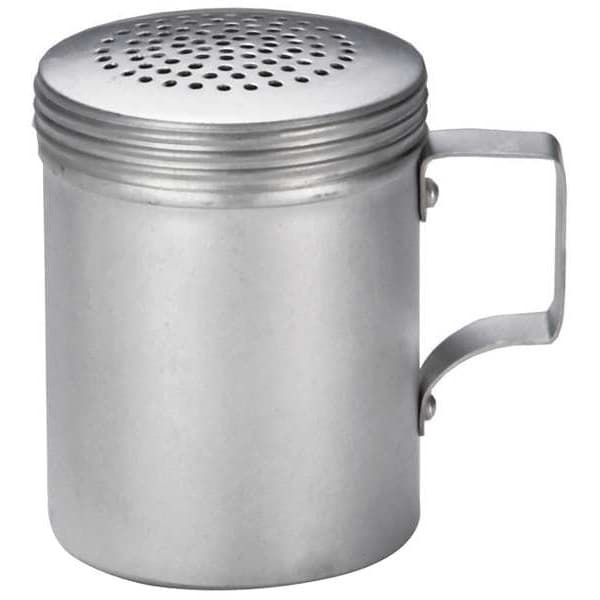 Dredge, Overall Height 3 1/2 in, Overall Diameter 2 5/8 in, Includes Handle, Lid Included Yes, Product Type Shaker with Handle and Top, For Food Type Salt; Sugar, Graduated No, Handle Included Yes, Hole Width 1 13/16 mm, Body Color Silver, Body Material Aluminum, Capacity 10 oz, Dishwasher Safe No, Lid Color Silver, Lid Material Aluminum, NSF Certified No, Package Quantity 12