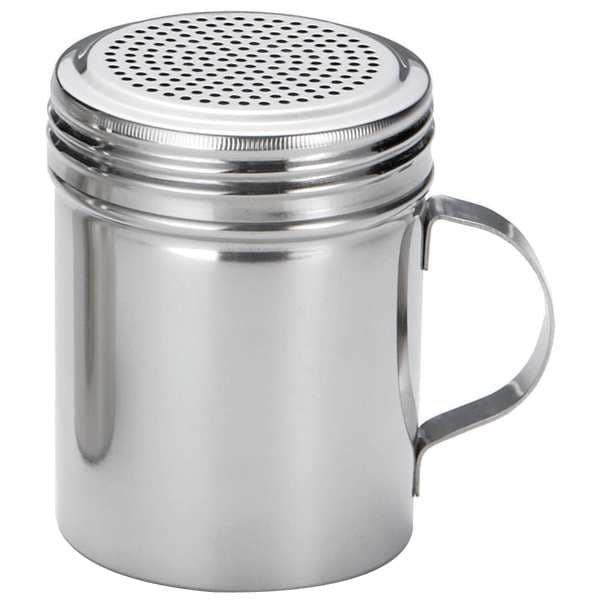 Dredge, Overall Height 3 3/4 in, Overall Diameter 2 3/4 in, Includes Handle, Lid Included Yes, Product Type Shaker with Handle and Top, For Food Type Salt; Sugar, Graduated No, Handle Included Yes, Body Color Silver, Body Material Stainless Steel, Capacity 10 oz, Dishwasher Safe Yes, Lid Color Silver, Lid Material Stainless Steel, NSF Certified No, Package Quantity 12
