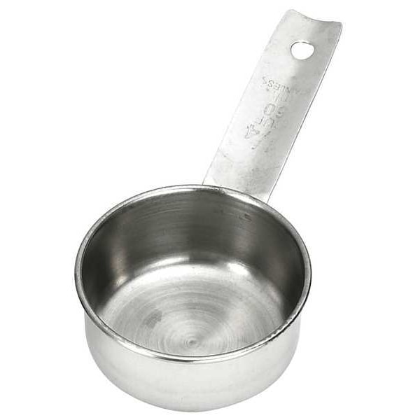 Measuring Cup, Diameter 2 1/4 in, Overall Height 1 1/8 in, Material Stainless Steel, Color Silver, Handle Color Silver, Handle Length 2 1/2 in, Handle Style Flat, Number of Pieces 1, Maximum Temperature Resistance 450 Degrees F, Gauge 200 ga, Capacity 0.25 C, Dry/Liquid Dry, Liquid, Product Type Measuring Cup, Graduation Subdivisions 1/4 cup, Overall Length 4 5/8 in, Overall Width 2 5/16 in, NSF Certified No