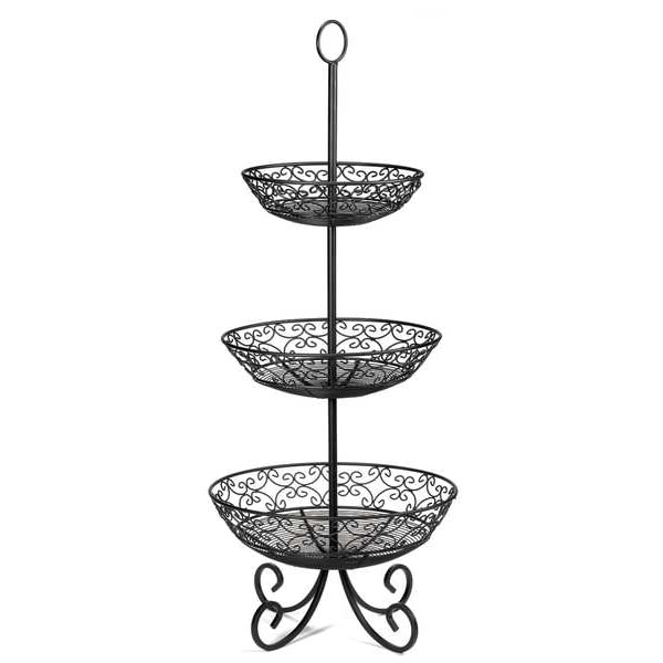 Food Serving Basket with Legs, Color Black, Material Steel, Handle Included No, Overall Depth 14 in, Dishwasher Safe No, Microwaveable No, Overall Height 33 1/2 in, Overall Length 13 7/8 in, Overall Width 13 7/8 in, Basket Design Three-Tiered, Product Type Food Serving Basket