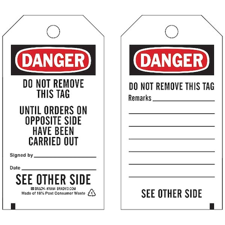Danger Tag, Cardstock, 5 3/4 in H x 2 7/8 in W, Black and Red on White, Rectangle, 100 PK