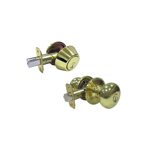 TruGuard, Polished Brass Finish, Mushroom Combo Lock Pack, Includes1 Keyed Tubular Entry Locksets 1 Single Cylinder Deadbolts, Medium Mushroom Style Knobs, For Exterior Doors, 5 Pin Cylinder, ReKeyable, KW1 Keyway, 3 Keys Provided, Adjustable Latch 2 38 To 2 34Utilize TV 113174 EZ1TRV When Making Duplicate Keys