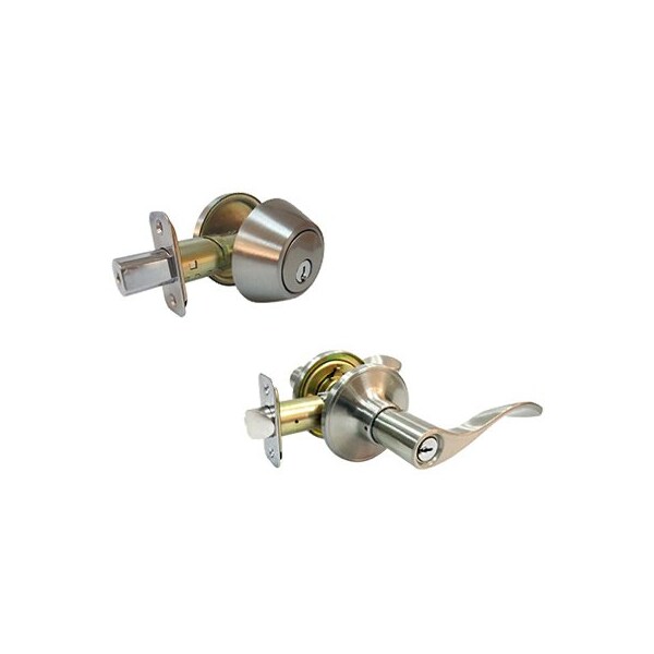 TruGuard, Satin Nickel, Bergamo Combination Lever Lockset, Includes 1 Keyed Entry Lockset 1 Single Cylinder Deadbolt, For Exterior Doors,5 Pin Cylinder, ReKeyable, Kw 1 Keyway, 3 Keys Provided, Adjustable Backset 238 Or 234, Keyed Alike In Sets Of 2, Utilize TV 113174 EZ1TRV When Making Duplicate Keys