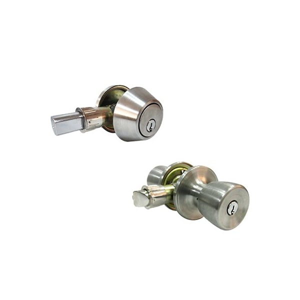 Tru Guard, Stainless Steel, Tulip Mobile Home Combination Lockset, Includes 1 Keyed Tubular Entry Lockset 1 Single Cylinder Deadbolt, Tulip Style Entry Knob, For Exterior Doors, 5 Pin Cylinder, ReKeyable, KW1 Keyway, 3 Keys Provided, Adjustable Latch Backset, 238 234, 2 Keyed Alike, Utilize TV 113174 EZ1TRV When Making Duplicate Keys
