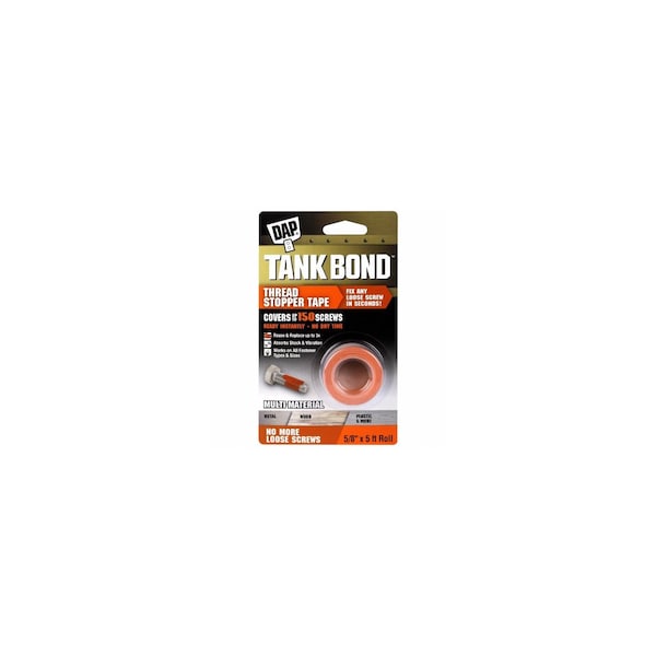 TAPE STOPPER THREAD 5/8INX5FT Specifications: Application: For appliances, automotive maintenance, building projects, cabinet hardware, construction fasteners, door handles, furniture assembly and repair, knobs and hinges, lawn care equipment, motorcycle and bicycle maintenance, PVC projects and assemblies and DIY projects applications Fix any loose screw in seconds. Tank Bond thread stopper tape is the ideal solution to fix anything that shakes, rattles, jiggles or comes loose around your home. The easy-to-apply tape keeps screws and bolts tightly in place while absorbing shock and vibration from everyday wear and tear but remains easily removable and even reusable up to 3X with each application. Works on all fastener types and sizes as well as on virtually any surface including metal, wood, plastic and more. Covers up to 150 screws or bolts so you can use it again and again throughout your house. Water and chemical-resistant formula can be used for interior or exterior and can help prevent leakage or stripping.