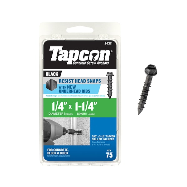 1/4 x 1-1/4 in Black Hex Head Concrete Anchors Climaseal Coating, Drill Bit Included, 75PK
