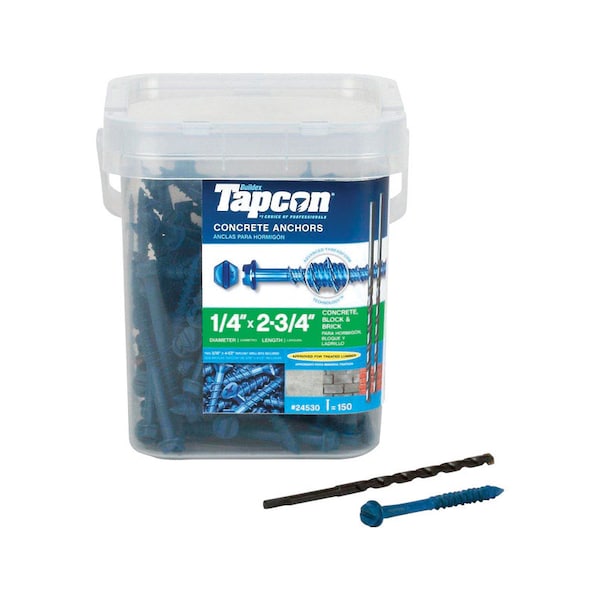 As the original concrete screw anchor that revolutionized the construction world, Tapcon brand concrete anchors deliver the ease of use, superior precision and unparalleled performance that professionals demand. Tapcon concrete screw anchors draw from its unique ability to TAP its own threads into concrete, making it an excellent alternative to expansion anchors, plugs and lag shields. Use Tapcon concrete screw anchors for installing sill plates, electrical equipment, furring strips and many other applications that require anchoring into concrete, block or brick.