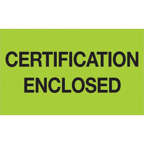 Tape Logic Labels, "Certification Enclosed", 3" x 5", Fluorescent Green, 500/Roll