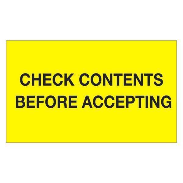 Tape Logic Labels, "Check Contents Before Accepting", 3" x 5", Fluorescent Yellow, 500/Roll