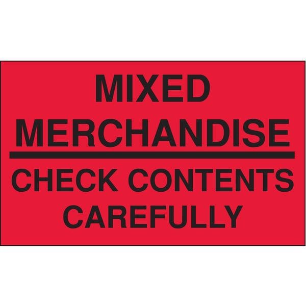 Instructional Handling Label, Language English, Primary Label Subject Shipping Contents, Message Header Interior Components, Message Mixed Merch., Check Contents, Label Width 5 in, Label Height 3 in, Material Adhesive Back, Paper, Background Color Red, Labels per Roll 500, Package Quantity 500