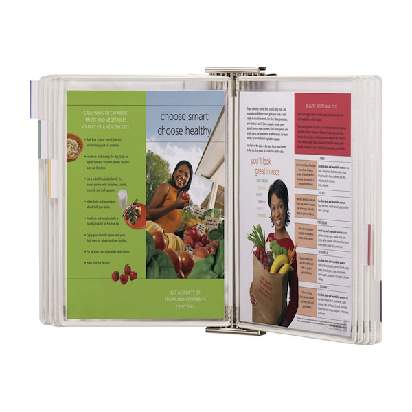 Wall reference system with 10 Sterifold white-framed display pockets. Combines the recognized characteristics of stainless steel (will not rust) and silver ion-treated anti-microbial PVC display pockets to deter microbial growth by eliminating micro-organisms. Display pockets are utilized by many different people throughout the course of a day. Tarifold’s Sterifold display pockets will release antimicrobial silver ions every time bacteria, mold, or fungi appears on the surface of the pockets. Silver ions will do the following to the microorganism: attack the cell wall; interrupt metabolism; prevent reproduction. For optimal protection, we recommend the display pockets be replaced every 2 years. Especially suitable for environments at high risk of microbial proliferation, including restaurants, medical, and pharmaceutical environments. 10 year product warranty.
