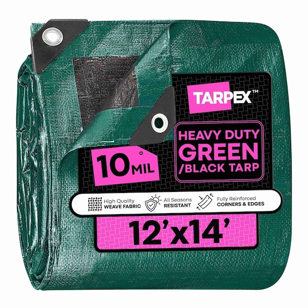 This TARPEX heavy-duty waterproof tarp is a dependable solution for protecting valuable items from the elements. Designed for multipurpose use, this tarp is ideal for outdoor coverage of tools, equipment, vehicles, building materials, and more. Its also great as a canopy or shelter at campsites and outdoor events. Crafted from durable 10 mil polyethylene, this tarp features a tightly woven 12 x 12 fabric weave, reinforced poly rope lining the edges, and double-stitched, hemmed corners for added strength and reliability.Built to withstand tough conditions, this tarp is waterproof, UV-resistant, and wind-resistant for long-lasting protection. It shields your belongings from heavy rain, sun exposure, and strong gusts of wind. Rust-resistant aluminum grommets are placed at all four corners and spaced every 18 inches along the edges, making it easy to fasten securely in place. The reversible design with contrasting colors helps conceal dirt and wear, making it an excellent choice for demanding outdoor environments.This TARPEX heavy-duty waterproof tarp is a dependable solution for protecting valuable items from the elements. Designed for multipurpose use, this tarp is ideal for outdoor coverage of tools, equipment, vehicles, building materials, and more. Its also great as a canopy or shelter at campsites and outdoor events. Crafted from durable 10 mil polyethylene, this tarp features a tightly woven 12 x 12 fabric weave, reinforced poly rope lining the edges, and double-stitched, hemmed corners for added strength and reliability.