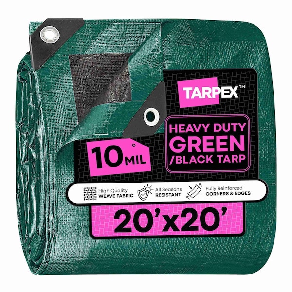 This TARPEX heavy-duty waterproof tarp is a dependable solution for protecting valuable items from the elements. Designed for multipurpose use, this tarp is ideal for outdoor coverage of tools, equipment, vehicles, building materials, and more. Its also great as a canopy or shelter at campsites and outdoor events. Crafted from durable 10 mil polyethylene, this tarp features a tightly woven 12 x 12 fabric weave, reinforced poly rope lining the edges, and double-stitched, hemmed corners for added strength and reliability.Built to withstand tough conditions, this tarp is waterproof, UV-resistant, and wind-resistant for long-lasting protection. It shields your belongings from heavy rain, sun exposure, and strong gusts of wind. Rust-resistant aluminum grommets are placed at all four corners and spaced every 18 inches along the edges, making it easy to fasten securely in place. The reversible design with contrasting colors helps conceal dirt and wear, making it an excellent choice for demanding outdoor environments.This TARPEX heavy-duty waterproof tarp is a dependable solution for protecting valuable items from the elements. Designed for multipurpose use, this tarp is ideal for outdoor coverage of tools, equipment, vehicles, building materials, and more. Its also great as a canopy or shelter at campsites and outdoor events. Crafted from durable 10 mil polyethylene, this tarp features a tightly woven 12 x 12 fabric weave, reinforced poly rope lining the edges, and double-stitched, hemmed corners for added strength and reliability.