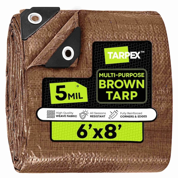 The Tarpex weather-resistant 5 mil polyethylene tarp is a dependable solution for shielding your valuable items from the elements. Ideal for a wide range of outdoor uses, this multipurpose tarp works great for covering equipment, construction materials, firewood, vehicles, and heavy-duty machinery.Crafted from 5 mil thick polyethylene, it features a durable 3.6-oz./sq. yd. weight, with an 8 x 8 fabric weave and double-sided lamination for extra strength. Reinforced poly rope is sewn into the hem, and the corners are reinforced for added durability. Built to resist heat, water, wind, and rain, the tarp maintains its shape and color without shrinking or fading-making it perfect for temporary walls, shade awnings, curtains, or weather barriers on job sites or at campsites.This lightweight yet tough tarp is UV- and water-resistant, designed to stand up to tough outdoor environments. Rust-resistant aluminum grommets are positioned on all four corners and spaced every 36 along the edges, making it easy to tie down securely. The dark color helps conceal dirt and wear, ensuring a cleaner appearance even with heavy use. Tarpex tarps run true to size, so you get the exact coverage you need without guessing or cutting corners-perfect for all-purpose outdoor protection.
