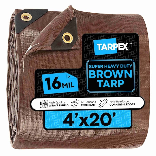 This TARPEX super heavy-duty weatherproof 16 mil tarp is a reliable solution for protecting important items from the elements! This multipurpose tarp is perfect for outdoor applications such as covering equipment, building materials, heavy machinery, or for use as awning coverage at campsites. The super heavy-duty 16 mil polyethylene material features a dense 16 x 16 fabric weave count, reinforced poly rope sewn into the hems, and hemmed, reinforced corners for maximum strength and durability.This tarp is waterproof, weather-resistant, and UV-treated for long-lasting performance, providing excellent protection against heavy wind, rain, and sun exposure. Rust-resistant brass grommets are reinforced and strategically placed on all four corners and every 18 inches along the outer hem, allowing for easy and secure tie-downs. The tarps earthy tones help conceal dirt and wear, making it an ideal choice for rugged outdoor use.Crafted with an 8 oz. per square yard weight and engineered to withstand harsh weather conditions, this tarp offers superior tear and rip resistance for dependable all-season protection. TARPEX tarps run true to size, ensuring a perfect fit for all your covering needs.