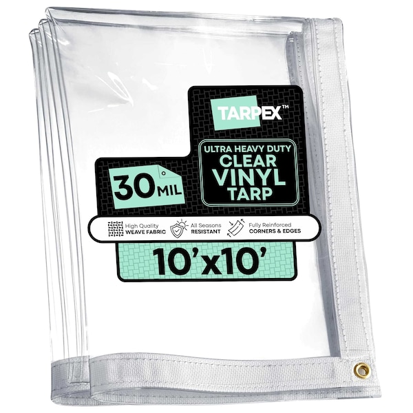 Get unmatched toughness with full visibility from the TARPEX 30 Mil Clear Vinyl Tarp. Made from ultra heavy-duty marine-grade PVC, this crystal-clear tarp is perfect for demanding jobs that require transparency-whether youre covering equipment, building temporary shelters, or using it as weather-blocking curtains in commercial or residential settings.All edges are reinforced with durable, double-stitched 2-inch wide white polypropylene web hems for long-lasting strength and superior tear resistance. Rustproof brass grommets are embedded every 24 inches along the perimeter, providing reliable tie-down points that hold fast under heavy strain and tension.Engineered for extreme durability, this tarp is waterproof, weatherproof, dustproof, and UV-treated to withstand harsh outdoor elements year-round. It resists tearing and punctures, performs well in subzero temperatures down to -30°F, and maintains true-to-size dimensions for full coverage. Its transparent design allows you to easily monitor the load underneath or keep clear sightlines when used as a curtain, awning, or temporary wall.