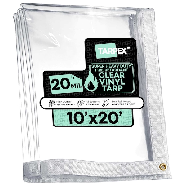 Stay protected and stay visible with the TARPEX 20 Mil Clear Fire-Retardant Tarp-your go-to solution for both heavy-duty coverage and fire safety. Made from super heavy-duty, marine-grade PVC vinyl, this tarp is flame-resistant and ideal for use around open flames, grills, fire pits, heaters, or in commercial spaces where safety compliance matters most.The crystal-clear construction allows for full visibility and light transmission, making it perfect for applications like patio enclosures, awnings, greenhouse covers, weatherproof walls, or equipment covers. Whether you're blocking wind and rain or building a protective barrier, this tarp delivers strength without sacrificing sight.Engineered to perform in all seasons, it is waterproof, weatherproof, dustproof, UV-resistant, and designed to stay flexible in freezing temperatures down to -30°F. The 2-inch wide white polypropylene web hem is double-stitched and reinforced around the perimeter for superior tear resistance when pulled tight.Rustproof brass grommets are spaced every 24 inches, providing reliable tie-down points for secure installations in any environment. The tarp is finished true-to-size for full coverage with no surprises.