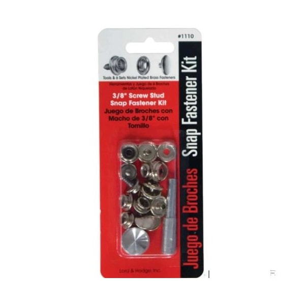 Nickel Plated 3/8'' Snap Faster Kit, 6 SetsEach Metal Snap Fastener Kit contains six sets of nickel plated 3/8'' screw stud snap fasteners, a flaring tool, and the setting base. This kit helps quickly and easily performs the task in replacing broken or missing snap fasteners in tarps, covers, shoes, clothes, curtains, bags, and many other items. The studs are provided for clamping on to the tarp material or other fabric in addition to screw studs utilized for mounting on hard surfaces. The six nickel plated snap fasteners include a stud, eyelet, button, and socket per set.