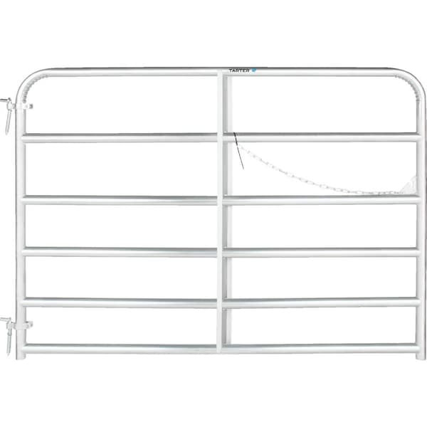 6-bar galvanized tube gate. Ideal for fencing pastures orchards and gardens. Also for placement at construction sites and crowd control. Gate is 3 inches shorter than listed length to allow for gate hardware and proper clearance. 50 inches high with galvanized Z-braces. Made from 1-3/4 inch round high-tensile strength galvanized tubing with superior continuous welded saddle joints. Gates come with hinges hinge pins and 22 inch snap chain. 19-gauge.