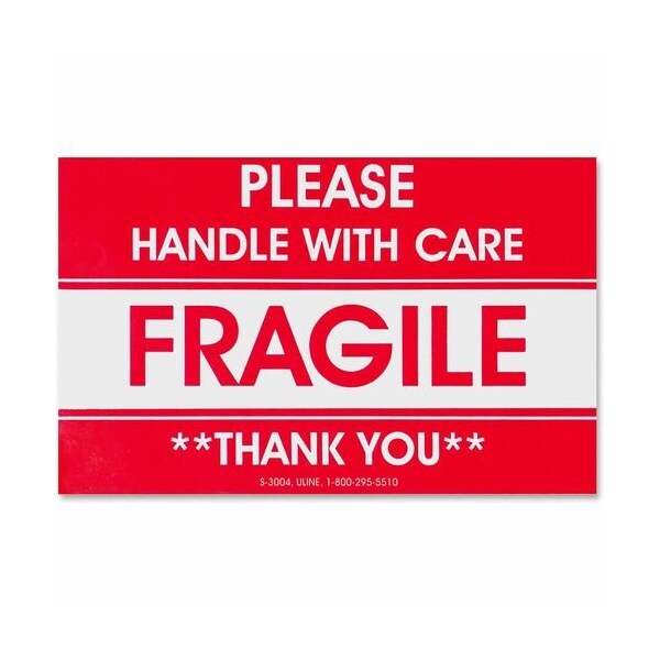 Shipping labels are preprinted with the message, ''Fragile/Please Handle with Care/Thank You,'' to alert mail handlers. High-quality, peel-and-stick, pressure-sensitive labels on a roll are easily dispensed.