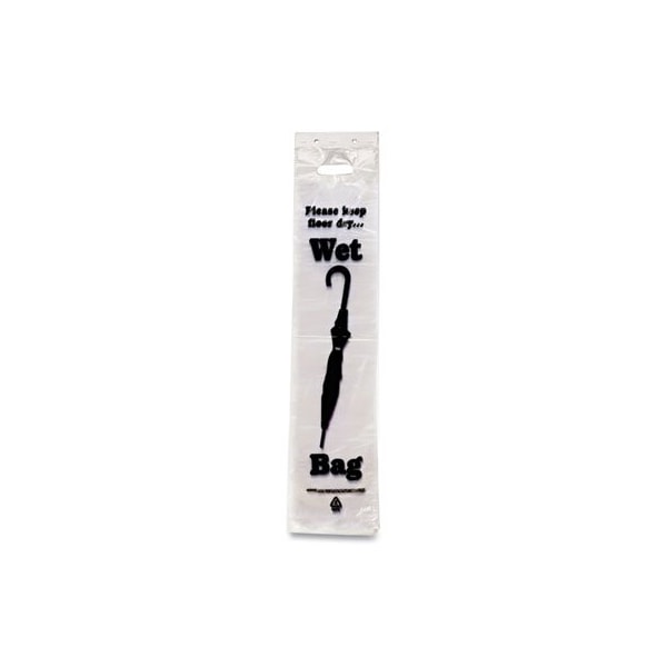 Umbrella bags help keep floors dry and help prevent slip-and-fall accidents, reducing liability lawsuits. Offer customers or visitors a welcome service. Includes die-cut handle and pocket for easy insertion or retrieval of umbrella. Recyclable bags are packed for easy display and fit virtually all sizes of umbrellas. Application: Umbrella Bag; Materials: Plastic; Width: 7in; Height: 31in.
