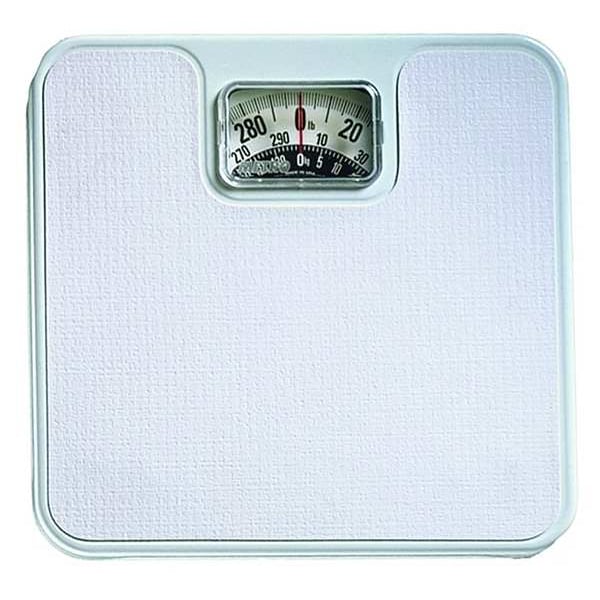Bath Scale, Capacity 136kg, 300 lb, Scale Graduations 1kg, 2 lb, Overall Length 10 1/4 in, Overall Width 10 1/2 in, Overall Height 2 in, Weighing Surface Width 10 1/2 in, Weighing Surface Depth 10 1/4 in, Steel, Analog Dial Scale Display, Includes White Mat, Digital/Mechanical Mechanical, Weighing Units kg, lb
