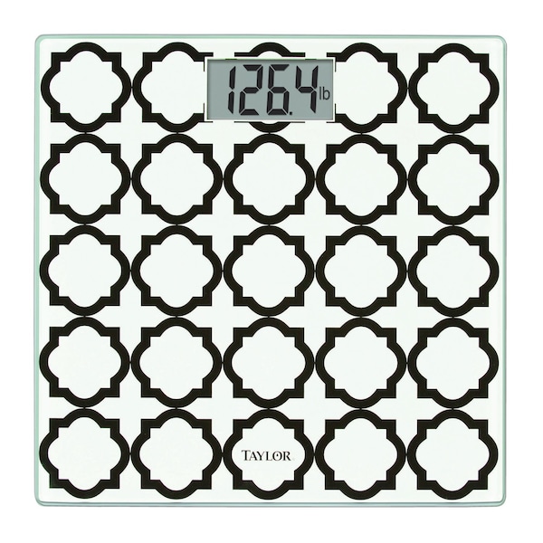This Taylor Precision Products Digital Glass Bathroom Scale is designed with a black-and-white lattice glass print' which is stylish for any room. An 11.8-in. x 11.8-in. platform is made from durable' tempered glass and has a 3.- in. x 1.5-in. display making it easy to view weight readings up to 400 lb. 2 AAA batteries are included. Provided in the box are clear instructions' troubleshooting tips.