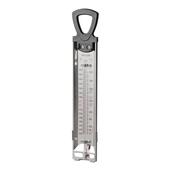 - • Ideal for candy or donuts, the classic candy, jelly and deep fry thermometer by Taylor does the job. Features red temperature indicator and large, easy-to-read black numbers display both Fahrenheit and Celsius, printed guides indicate hard ball, thre
