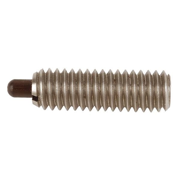 Spring Plunger, Thread Size 3/8 In.-16, Thread Length 1.125 in, Nose Shape Standard, Plunger Material Delrin, Plunger Dia. 0.1860 in, Plunger Projection 0.187 in, Mounting Type Hex Socket Drive, Body Length 1.125 in, Final Nose Force 14.5 lbf, Flange Thickness Not Applicable, Initial Nose Force 5.5 lbf, Overall Length 1.312 in, Plunger Width 0.186 in, Thread Pitch 0.063 in, Handle Type Not Applicable, Body Finish Uncoated, Body Material Stainless Steel, Handle Material Not Applicable