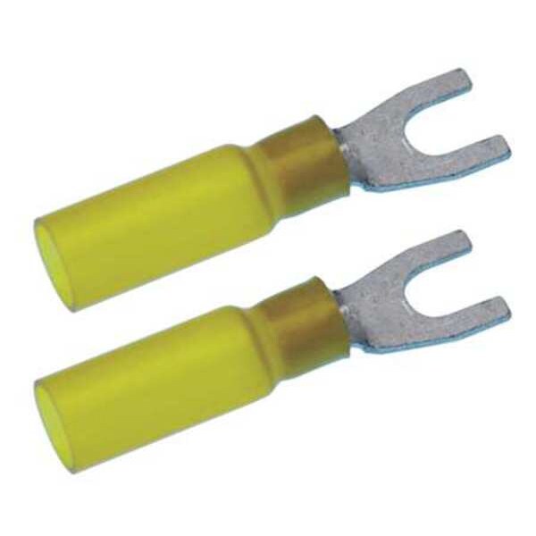 Fork Terminal, Contact Finish Tin, Contact Material Copper, Insulation Color Yellow, Insulation Material Nylon, Maximum Operating Temperature 257 Degrees F, Maximum Voltage 600 V, Maximum Wire Size 10 AWG, Stud Size #10, Termination Style Crimp and Heat Shrink, RoHS Compliant Yes, Seam Style Brazed, Standards UL Listed, Barrel Style Funnel Entry, Insulation Grip, Connection Material Tin-Plated Copper, Connection Type Crimp, Insulation Type Heat Shrink, Minimum Operating Temperature -67 Degrees F