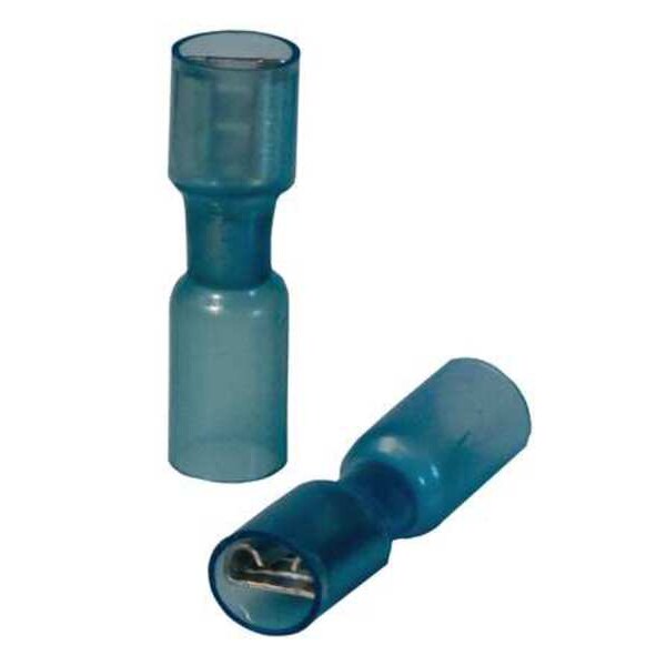 Female Disconnect, Contact Finish Tin, Contact Material Brass, Insulation Color Blue, Insulation Coverage Full Coverage, Insulation Material Polyamide, Maximum Operating Temperature 257 Degrees F, Minimum Wire Size 16 AWG, Maximum Wire Size 14 AWG, Maximum Voltage 600 V, Tab Thickness 0.032 in, Tab Width 0.25 in, Terminal Type Socket, Termination Style Crimp, RoHS Compliant Yes, Seam Style Brazed, Standards EU ELV Directive 2000/53/EC, UL Listed, Barrel Inside Diameter 0.08 in
