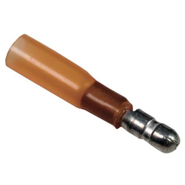 Male Bullet Disconnect, Contact Finish Tin, Contact Material Copper, Disconnect Style Bullet, Insulation Color Red, Insulation Coverage Full Coverage, Insulation Material Nylon, Maximum Operating Temperature 257 Degrees F, Minimum Wire Size 22 AWG, Maximum Wire Size 18 AWG, Maximum Voltage 600 V, Tab Width 0.15 in, Terminal Type Tab, Termination Style Crimp, Seam Style Brazed, Standards E157833, E87681, UL Listed, Barrel Inside Diameter 0.055 in, Insulation Type Heat Shrink