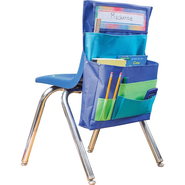 Organize supplies with this convenient storage solution. Clear pocket holds name plate up to 3.5" x 11.5". 7 storage areas: Large pockets are ideal for workbooks, folders, etc. and small pockets are ideal for supplies. Made with durable canvas. Metal rivets provide extra strength at stress points. Easily slides over back of chair up to 15" wide, 5" from top. Measures 15.5" x 18". Sold as a pack of 2 chair pockets.